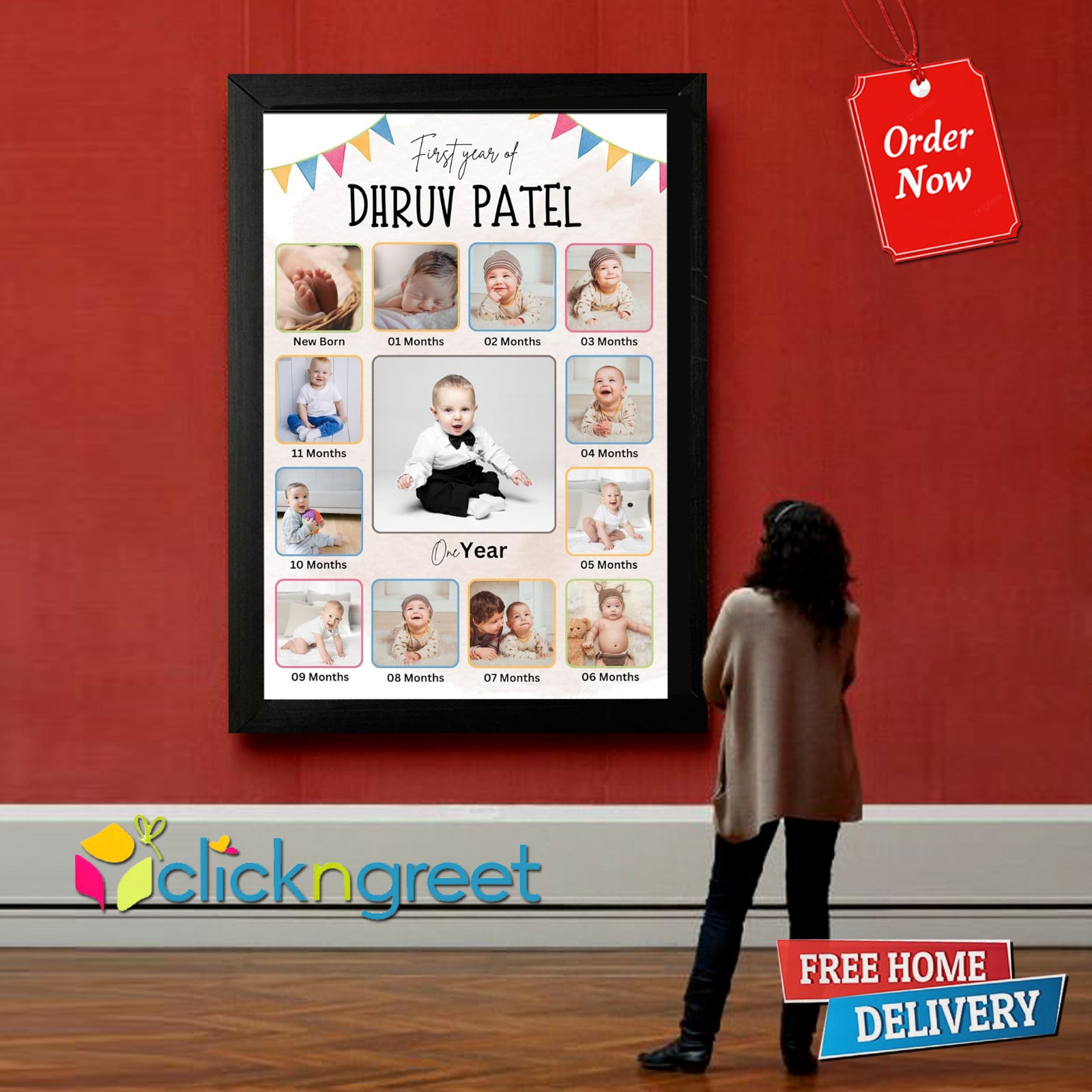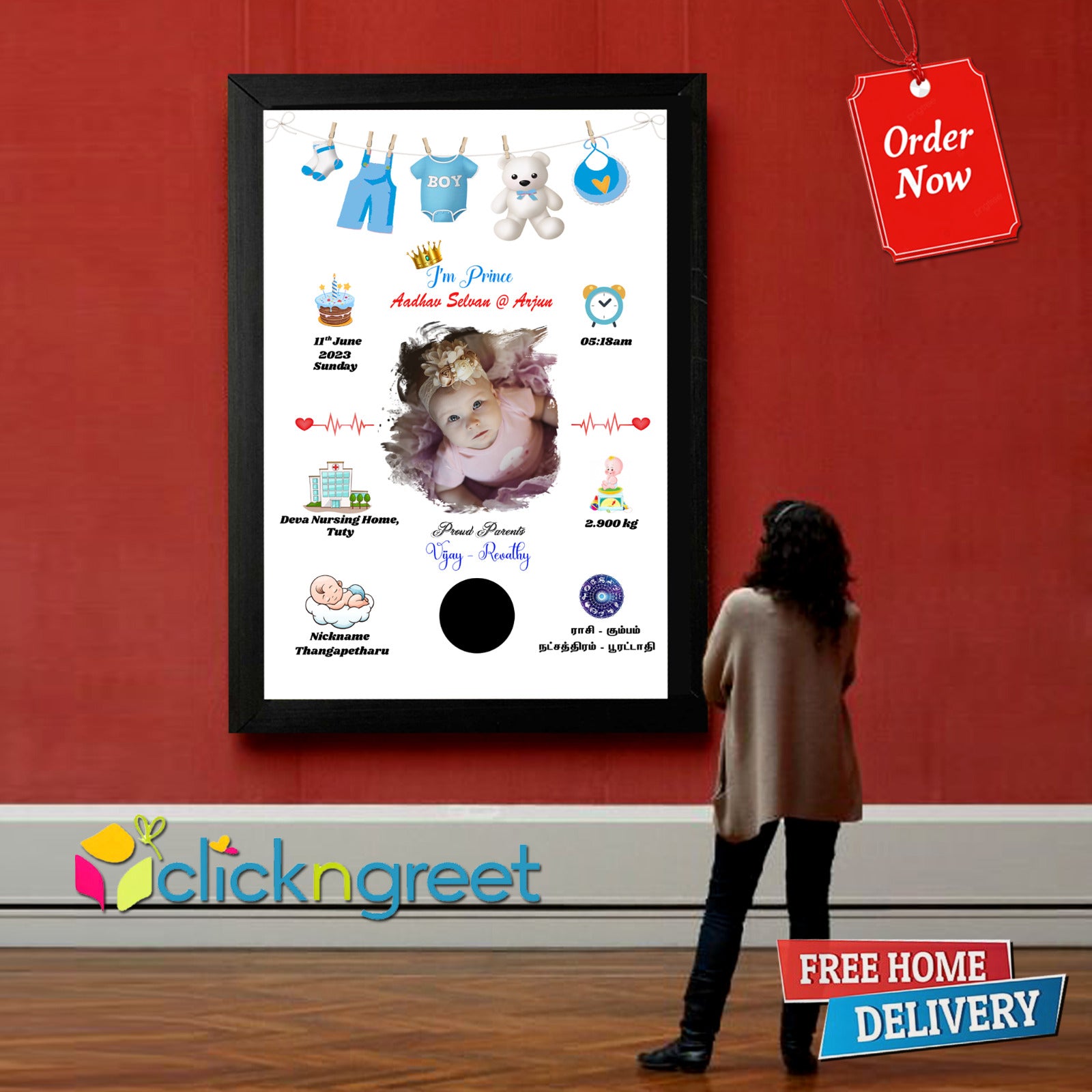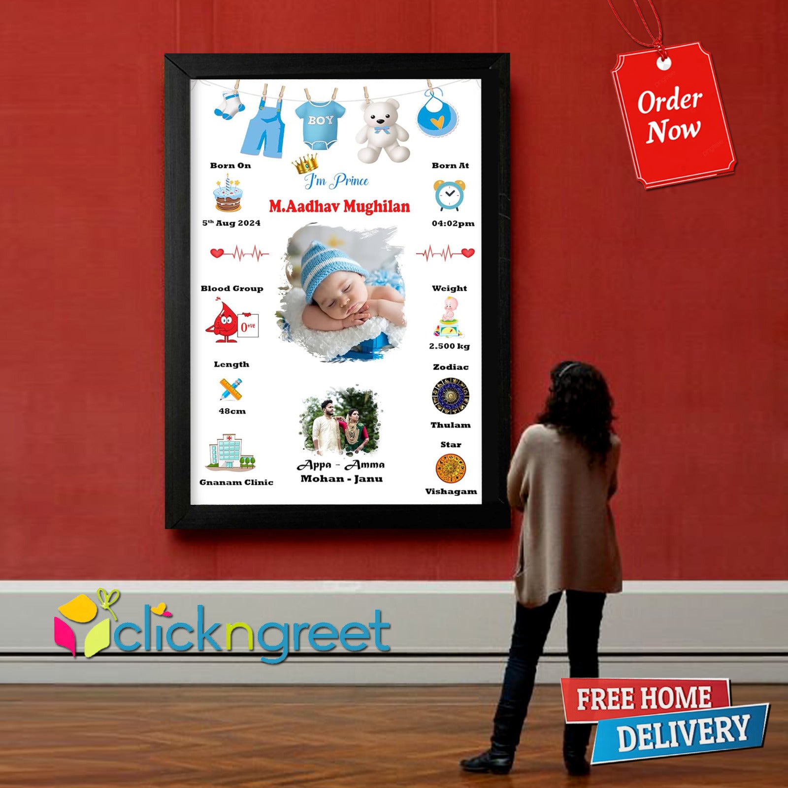 Personalized Baby Boy 1st Year Birth Details Glitter Frame – Custom Keepsake Wall Art