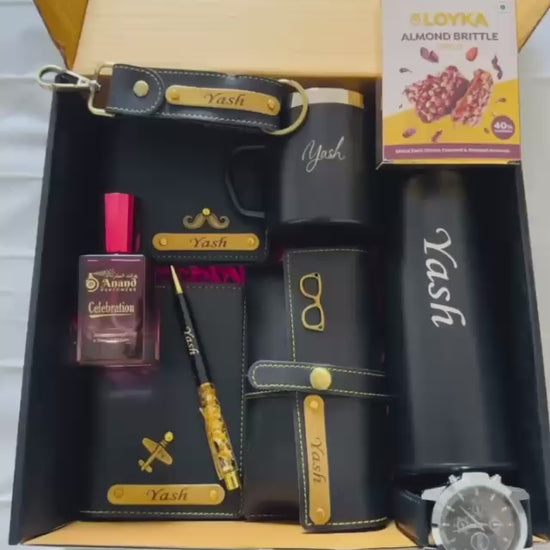 🎁 Ultimate All-in-One Gift Set – Carefully curated combo pack featuring 9 stylish essentials: keychain, goggles cover, passport holder, pen, ceramic mug, wristwatch, temperature bottle, premium chocolate, and elegant perfume.